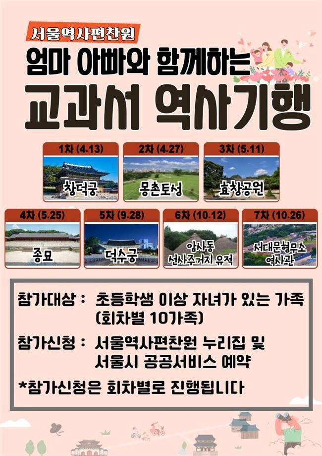 [세계로컬타임즈 이효진 기자] 서울역사편찬원은 토요일 주말, 자녀와 함께 교과서 속 역사 현장으로 떠나보는 ‘엄마아빠와 함께하는 교과서 역사기행(이하 교과서 역사기행)’을 준비한다.