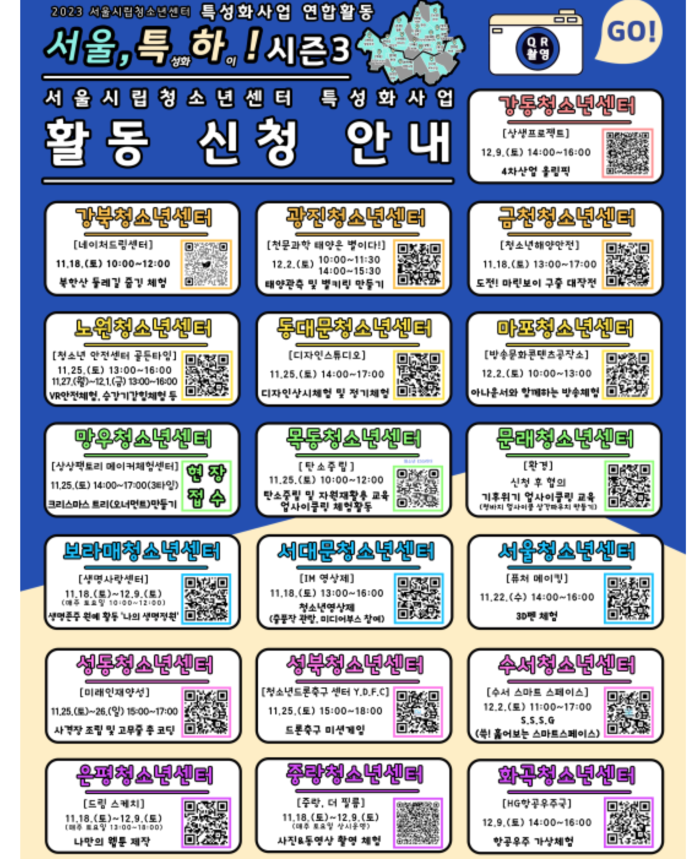 [세계로컬타임즈 이효진 기자] 18일부터 12월 9일까지 4주간 서울시 청소년센터 곳곳에 청소년들을 위한 체험행사 ‘서울, 특하!(서울시 청소년과 함께 하는 특별한 하루)’가 개최된다.