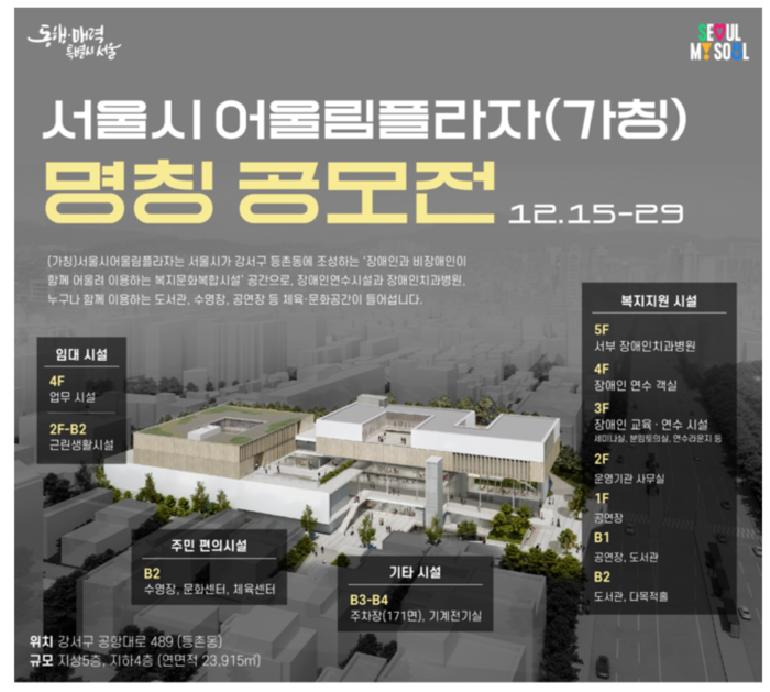 [세계로컬타임즈 이효진 기자] 서울시는 복지‧문화 복합시설로 조성 중인 ‘(가칭) 어울림플라자’에 대한 명칭 공모한다.