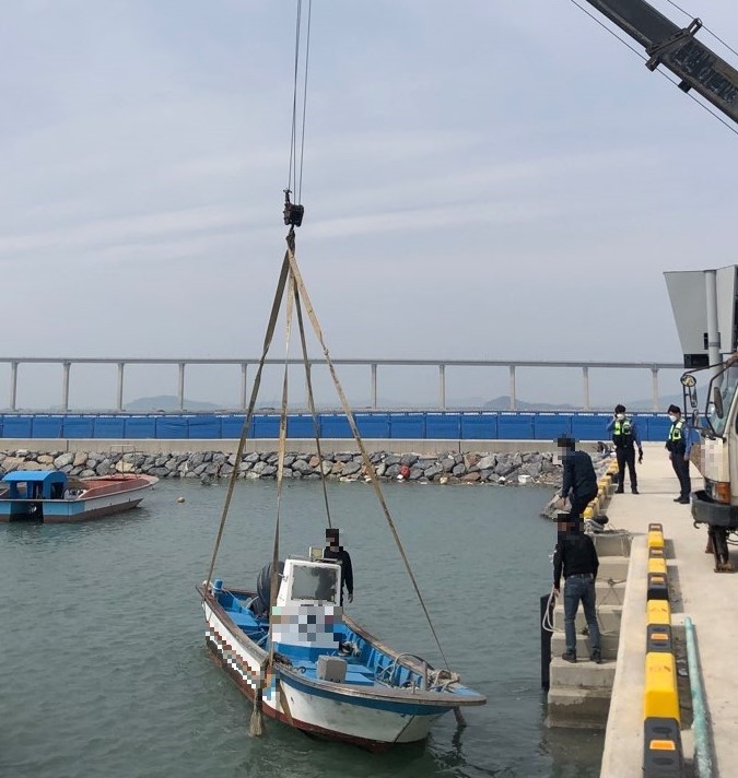 | ▲침수선박 A호가 크레인을 통해 인양되고 있다.(사진=목포해경) |