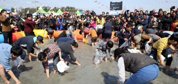 | ▲ 지난해 강진사초개불&낙지축제에 참가한 시민들이 개불잡기 체험행사를 진행하고 있다.<사진제공=강진군청> |