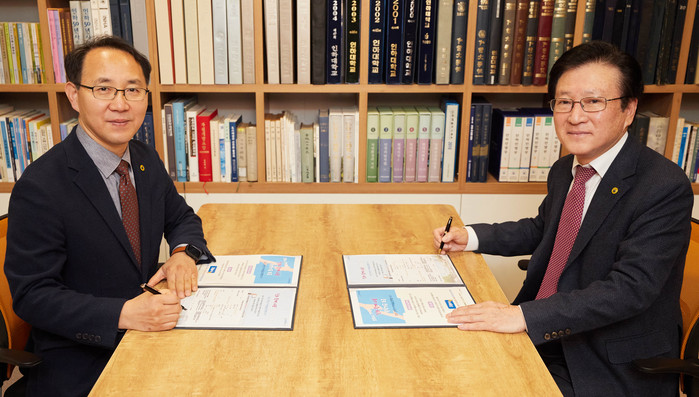 | ▲ 이장현 인하대 대외협력처장(사진 왼쪽)과 이용기 인하대 총동창회장이 장학기금 모금 약정서를 작성하고 있다. (사진=인하대 제공) |