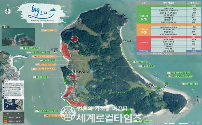 효자도 어촌뉴딜 300사업은 ▲호안 접안시설 및 어업 공동작업장, 명덕 해변공원 조성 등 7개 사업 86억 원 ▲어촌민속가옥 및 커뮤니티센터 조성, 마을경관 정비 등 4개 사업 50억 원 ▲주민 역량강화 교육 및 도서 브랜드 개발 등 소프트웨어 분야 5개 사업 7억 원 등 모두 157억 원을 투입하게 된다.