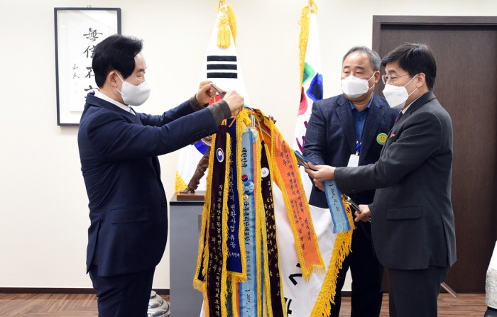 | ▲안병용 의정부시장은 1월 14일 시장실에서 2020년 어린이보호구역 개선 유공 장관 표창을 전수했다. (사진=의정부시 제공) |