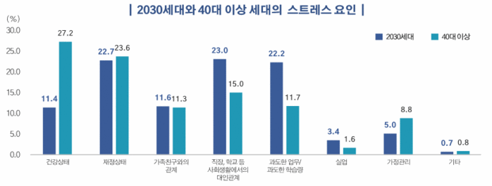 이들의 거의 절반(46.6%)은 스트레스를 느끼고 있으며, 주원인은 대인관계(23.0%), 재정상태(22.7%), 과도한 업무·과도한 학습량(22.2%) 순이었다.