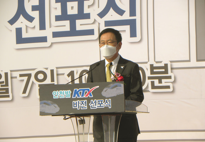 | ▲ 인천 수인선 송도역 광장 앞에서 개최된 '인천발 KTX 비전 선포식'에서 박남춘 인천광역시장이 비전 선포식을 하고 있다.(사진=인천시) |