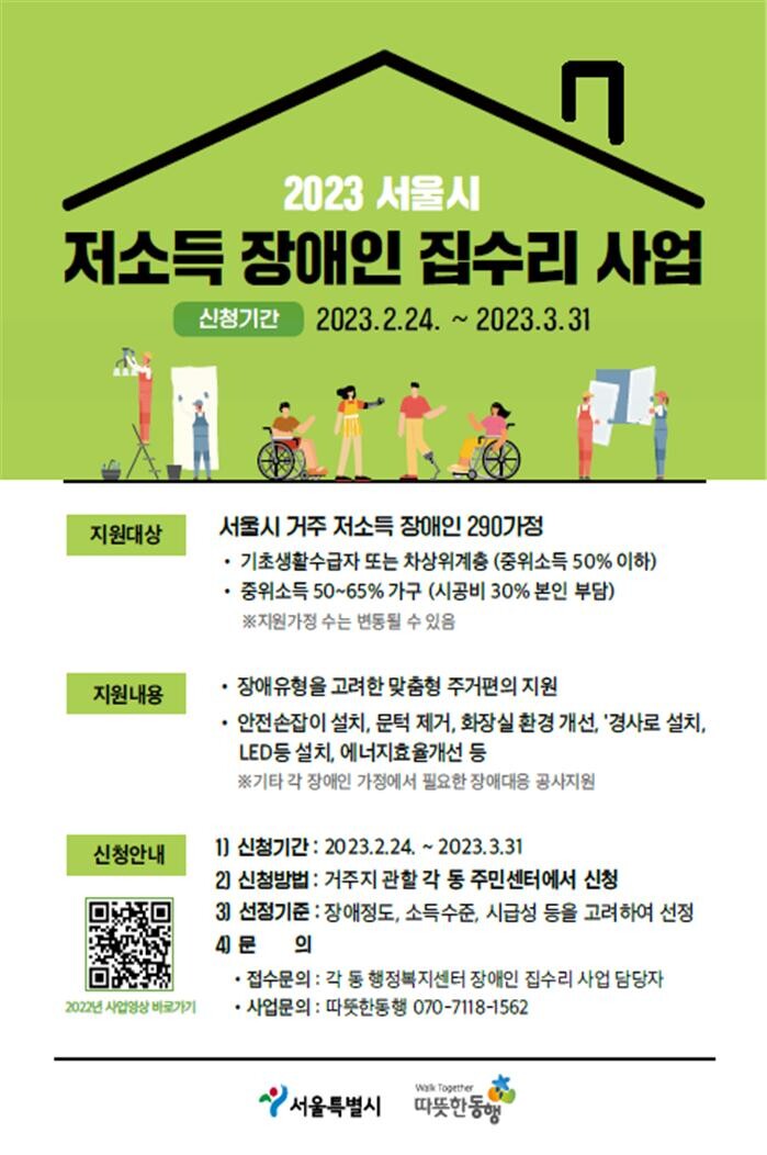 [세계로컬타임즈 이효진 기자] 서울시는 31일까지 2023년 저소득 장애인 주거편의 지원(집수리, 이하 집수리) 사업 참여자를 모집한다.