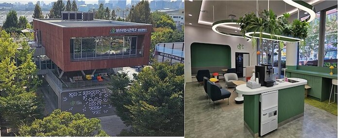 ▲ 성동캠퍼스 전경 (왼쪽) 및 1층 커뮤니티 라운지 (사진=서울시) |