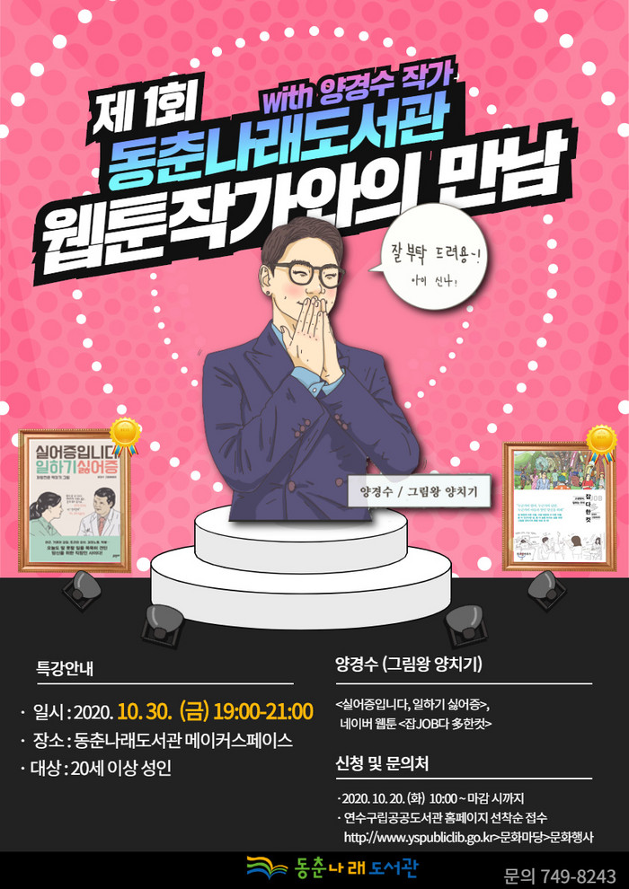 연수구는 동춘 나래도서관이 오는 30일 오후 지역주민을 대상으로 양경수 작가와 함께하는 웹툰 작가와의 만남 특강이 열린다고 13일 밝혔다.