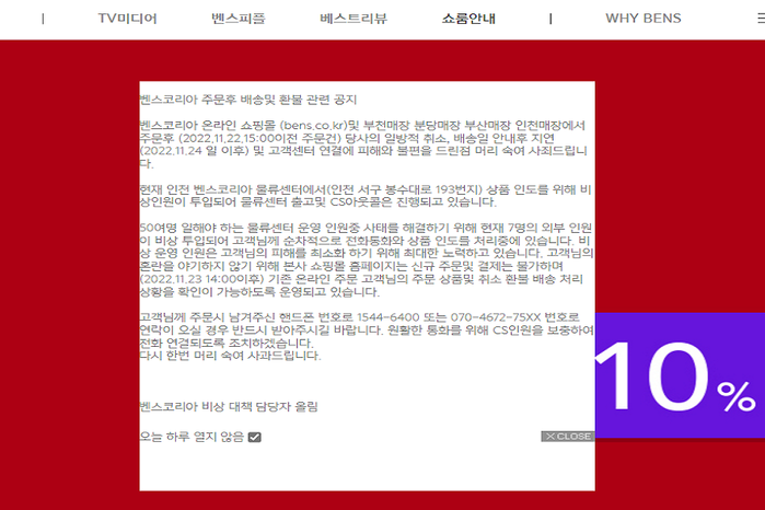 | ▲인천시가 벤스코리아 인터넷 쇼핑물 가구 판매사에 피해주의보 발령했다.(사진=벤스코리아 홈페이지 캡처) |