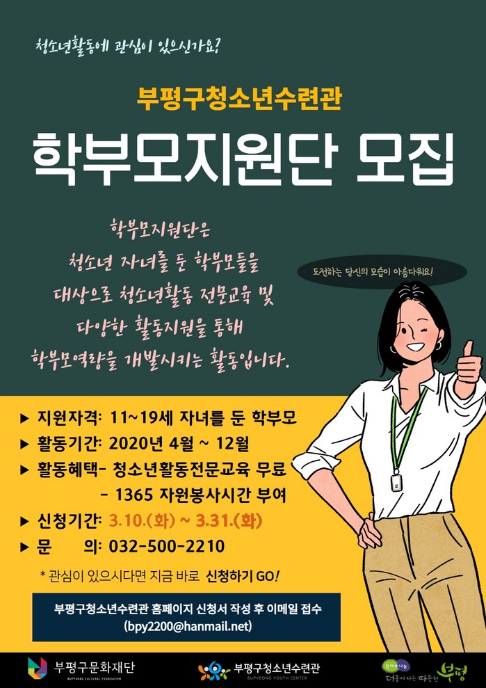 [세계로컬타임즈 장선영 기자] 인천 부평구 청소년수련관은 2020년도 청소년 활동프로그램 운영 및 청소년 관련 전문교육에 참여할 학부모 지원단을 모집한다.
