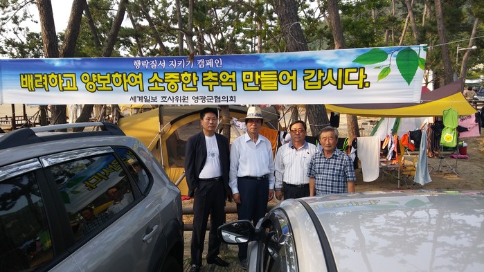| ▲ 세계일보 전남 영광군 조사위원 협의회 회원들이 지난달 29일 가마미 해수욕장에서 행락질서지키기 캠페인을 전개한 후 기념촬영하고 있다. |