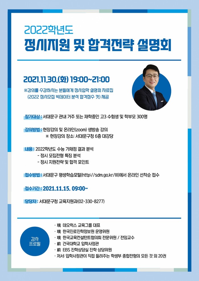 [세계로컬타임즈 배건식 기자] 서대문구는 오는 30일 저녁 7시부터 관내 수험생과 학부모를 대상으로 ‘2022학년도 정시 지원 및 합격 전략 설명회’를 개최한다.