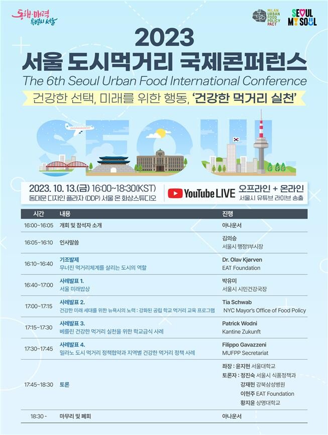 2023 서울 도시먹거리 국제콘퍼런스는 ‘건강한 선택, 미래를 위한 행동, ‘건강한 먹거리 실천’‘을 주제로, 국내·외 전문가들이 국제기구, 도시별 우수 사례를 공유하고 연대를 강화할 예정이다.