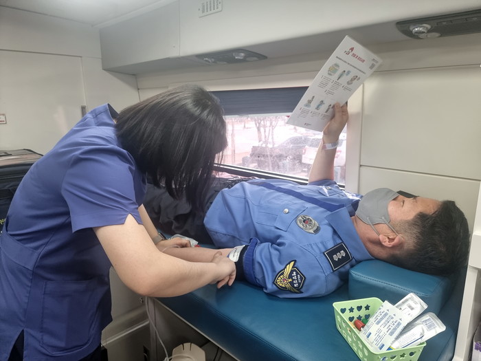 | ▲서해지방해양경찰청 한 직원이 21일 오전 청사 내 헌혈버스에서 혈액 수급난 해소를 위한 헌혈에 동참하고 있다.(사진=서해지방해양경찰청 |