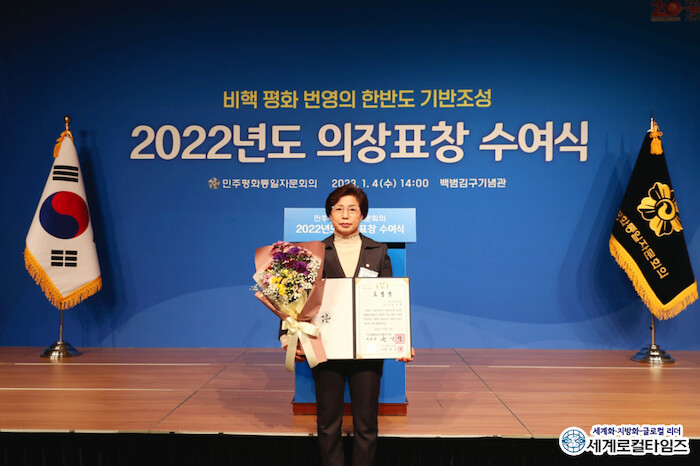 8일 부안군의회에 따르면 김두례 의원은 지난 4일 백범김구기념관에서 개최한 민주평화통일 자문회의 ‘2022 의장(대통령)표창 수여식’에서 의장표창을 받았다.
