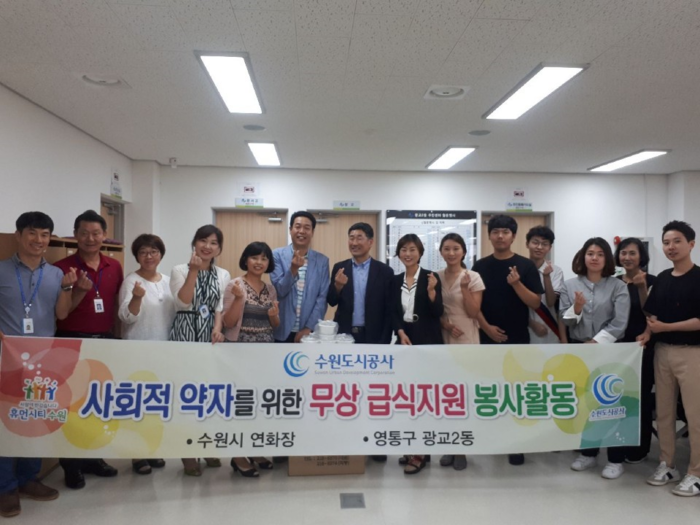 | ▲ 8일 수원시연화장사업소 및 광고2동주민센터 직원들이 무상급식 행사에 참여하고 기념촬영을 하고 있다. |