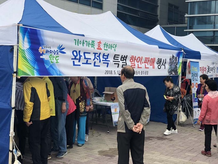 ▲12일 기아자동차 광주공장에서 펼쳐진 기아가족 효 한마당잔치에서 완도 전복 특별할인 판매 행사를 하고 있는 모습. <사진제공=완도군청> |