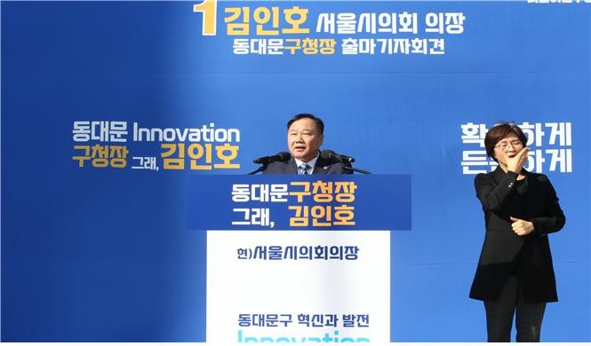 [세계일보 조사국 박종길 중앙위원] 제7대 서울시의원에 재정경제위원장, 제8대 최연소 부의장, 현 9대 최연소 의장으로 제17대 대한민국 시도 의장협의회 회장을 역임 중인 김인호 서울시의회 의장(더불어민주당, 동대문3)은 지난 4일 지역구인 동대문구청 앞 광장에서 동대문구청장 출마 기자회견을 가졌다.