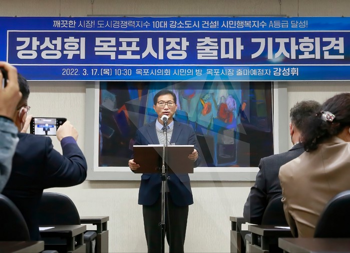 강 전 도의원은 17일 목포시의회 시민의방에서 기자회견을 통해 "'목포발전', '시민행복'을 목표로 목포를 대도시 못지 않은 경쟁력과 삶의 질을 갖춘 미래형 강소도시, 서울이 안 부러운 시민이 행복한 목포를 만들겠다“고 포부를 밝혔다.