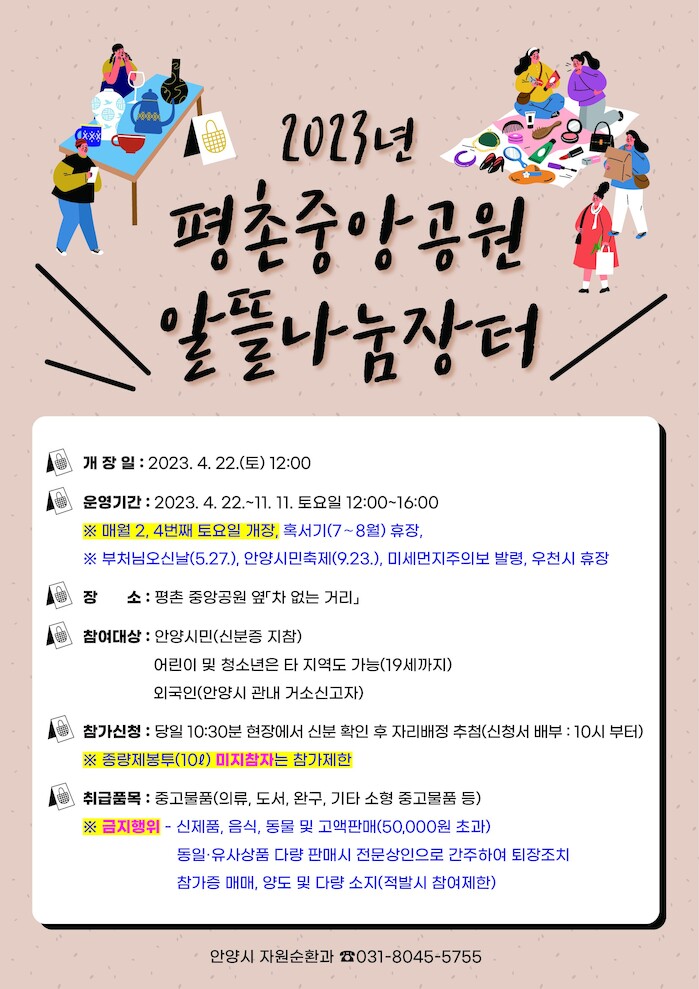 참여를 원하는 시민은 신분증과 종량제 봉투를 지참해 개장 당일 오전 10시까지 평촌중앙공원 접수처로 방문해 신청하면 된다.
