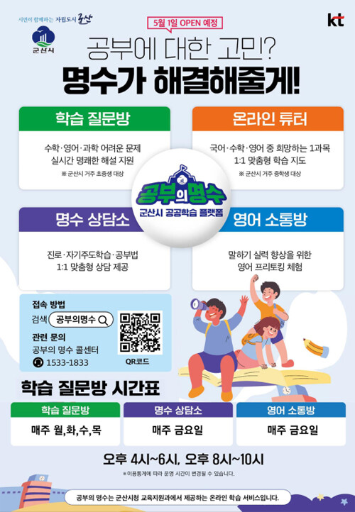 ‘공부의 명수’는 군산시 거주 초·중등학생이라면 누구나 접속해 모르는 문제에 대해 실시간으로 해설 강의를 지원하는 ‘학습질문방’과 1:1 맞춤형 멘토링을 제공하는 ‘온라인튜터’, 진로 상담·자기주도학습 공부법 등을 알려주는 ‘명수상담소’, 영어프리토킹 체험을 할 수 있는 ‘영어 소통방’으로 운영된다.