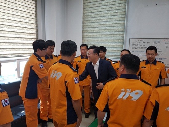 [세계로컬신문 최원만 기자] 김성제 의왕시장이 지난 29일 소방 안전센터를 방문해 대원들과 악수하고 있다.<사진제공=의왕시청>