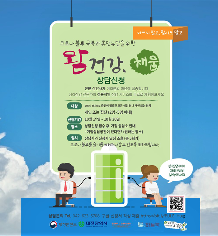 ‘뫔(몸 + 마음) 건강, 채움’이라는 주제로 코로나 장기화로 인해 마음 충전이 필요한 시민들을 대상으로 심리 건강상담을 제공하는 코로나블루 극복 프로젝트다.