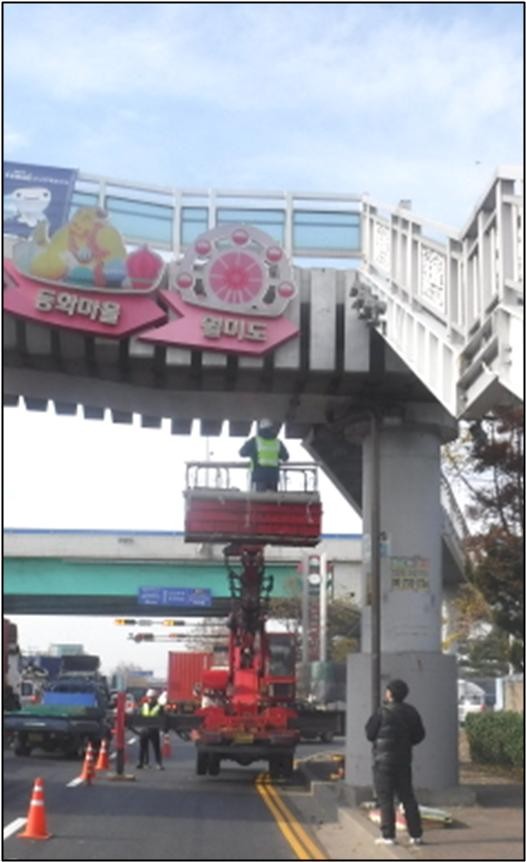 | ▲ 인천 중구 관계자가 스카이차량을 동원해 육교 안전점검을 하고 있다. (사진=인천 중구 제공) |
