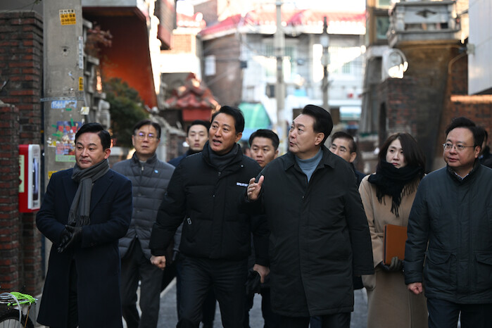▲ 윤석열 대통령이 원희룡 국토교통부 장관, 오세훈 서울시장, 조규홍 보건복지부 장관과 함께 지난달 21일 서울 중랑구 소규모 주택정비 관리지역인 모아타운 사업지를 찾아 도심 주택공급 현장을 시찰하고 있다. (사진=대통령실) |