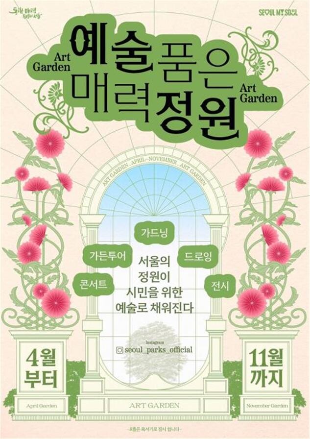서울시는 시민들이 사계절 내내 공원을 즐길 수 있도록 4월 27일 ‘음악이 흐르는 정원’을 시작으로 <예술품은 매력정원>프로그램을 11월까지 선보인다.