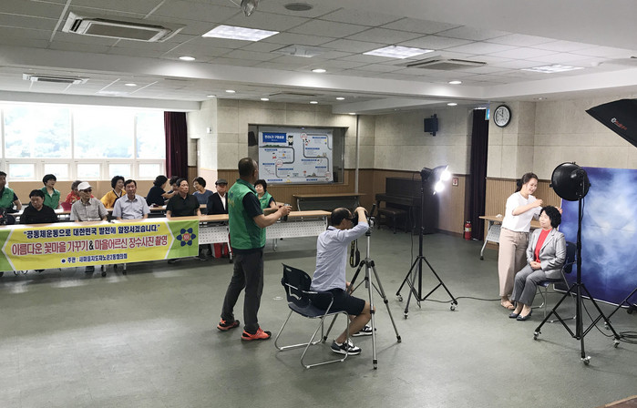 이날 행사에는 새마을지도자협의회 회원 5명이 참여했다. 이들은 회의실을 사진 스튜디오로 세팅하고 어르신들의 옷매무새를 살펴드리고 사진 촬영 봉사에 나섰다.
