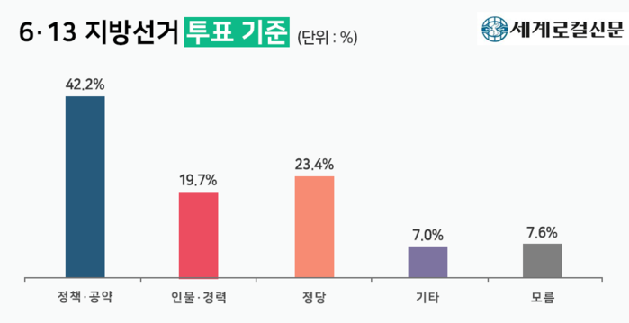 후보 선택은 ‘정책·공약’을 기준으로 결정하겠다고도 조사됐다. 이번 구청장 선거에서 어떤 기준으로 후보를 선택하겠느냐는 질문에 42.2%의 응답자가 ‘정책·공약’이라고 답했다. ‘정당’(23.4%), ‘인물·경력’(19.7%)이 뒤를 이었다. (모름 7.6%, 기타 7.0%)
