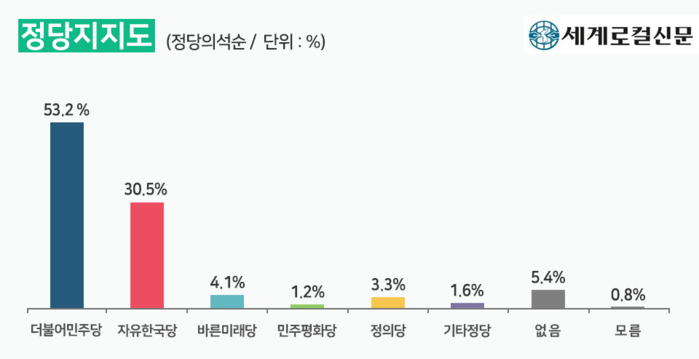 | ▲ 세계로컬신문과 뉴스티앤티·브레이크뉴스가 (주)코리아정보리서치에 의뢰해 조사한 정당지지도. |