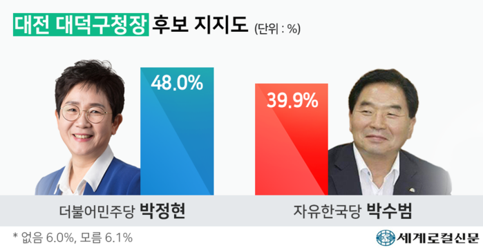 대덕구청장 지지율 조사에서 박정현 후보가 48.0%의 지지율을 얻어 선두를 달리는 것으로 조사됐다. 박수범 후보는 39.9% 지지율로 박정현 후보 뒤를 바짝 쫓고 있다.