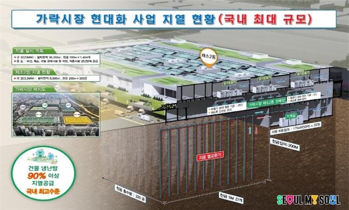 가락시장은 냉‧난방 90% 이상을 지열로 공급하며, 상시 운영시설인 경매장 저장·저온 시설, 중도매인 점포는 냉·난방 100%를 지열로 공급하는 지열 명소로 만든다.