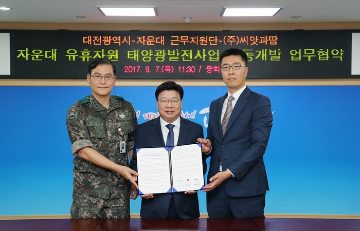 대전시는 7일 시청 중회의실에서 자운대 근무지원단, ㈜씨앗과땀과 ‘군부대 내 대단위 도심 태양광발전사업 공동추진 업무협약’을 체결했다.