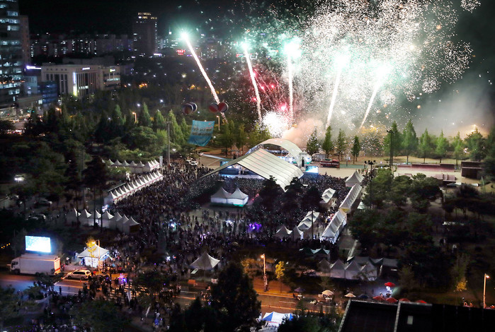 | ▲2017 힐링 아트페스티벌 행사장에서 불꽃놀이가 진행되고 있다. <사진제공=대전 서구청> |