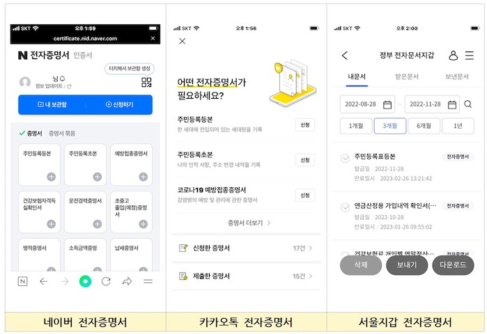 스마트폰 하나면 정부24(약 300종), 네이버(62종), 카카오(7종), 신한은행(5종), 토스(64종), 서울지갑(8종) 등 모바일앱에서 전자증명서를 발급 받아 원하는 기관에 제출할 수 있다.