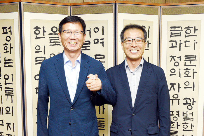 | ▲ 유영록 김포시장(왼쪽)이 지난 27일 유네스코 한국위원회 김광호 사무총장과 '한강하구 남북공동조사'에 대해 논의한 후 기념촬영하고 있다.<사진제공=김포시청> |