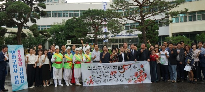 유한호 만안구청장은 기념사에서“두 팔 벌린 모습으로 주민을 맞아주며 이 자리를 굳건히 지켜온 청사의 50주년을 자축하며, 현재의 청사가 소임을 다하는 날까지 지속가능한 안양시를 만들기 위해 만안구 공직자 모두 더욱 노력하겠다”고 말했다.