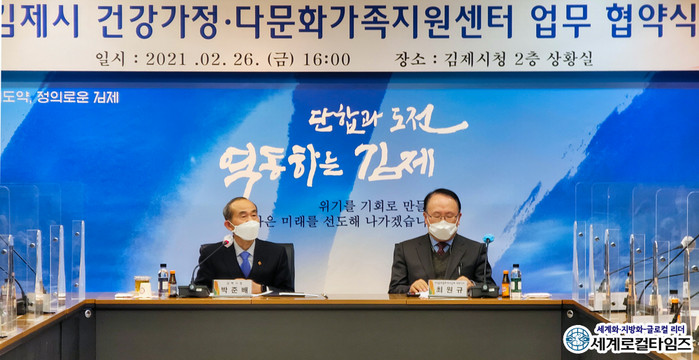 | ▲사진은 2021년 2월 26일 김제시가 건강가정·다문화가족지원센터 업무 협약을 진행하고 있다. (세계로컬타임즈 DB) |
