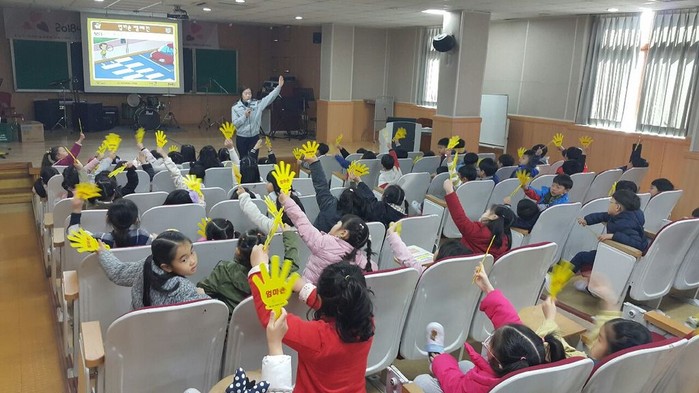 이날 학교를 방문한 경찰관이 횡단보도를 건널 때 지켜야할 수칙인 방어보행 3원칙 '서다, 보다, 걷다' 등을 교육했다. 이론 교육 후 아이들이 실제로 이를 실습해보는 시간도 가졌다.