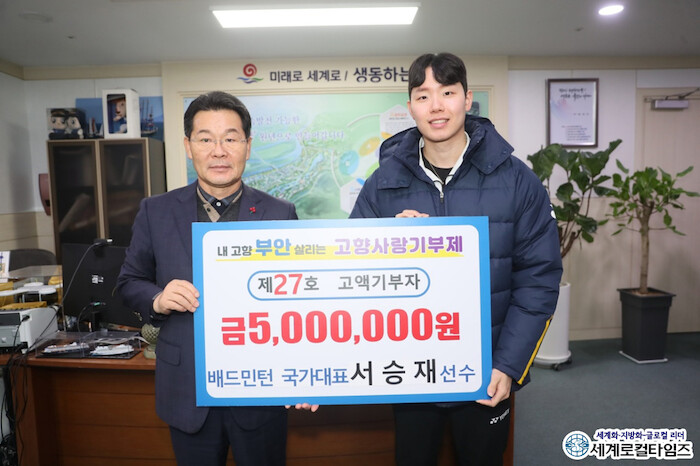 [세계로컬타임즈 조주연 기자] 전북 부안군이 “배드민턴 서승재 선수가 부안군에 고향사랑기부금 500만 원을 기탁했다”고 22일 밝혔다.