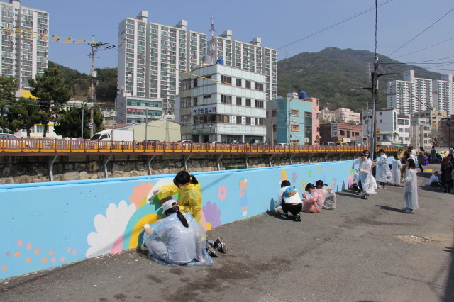 [세계로컬신문 김수진 기자] 부산시 북구 화명동 인근 대천천 주변 황량했던 회색의 옹벽이 자원봉사자들의 손길로 아름다운 그림을 덧입혀 새로운 볼거리로 변신했다.