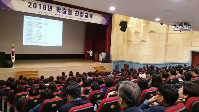 26일 시에 따르면 지난 24일 평생학습관 대강당에서 진행된 친절교육은 공공기관을 대상으로 유형별 고객 응대기법 및 친절교육을 진행하고 있는 효성ITX 교육리서치팀 이신영 강사를 초청해 △친절의 가치와 중요성 △친절 마인드 확산 △민원인을 대하는 기본자세 △응대 개선 방안에 대해 실시됐다.