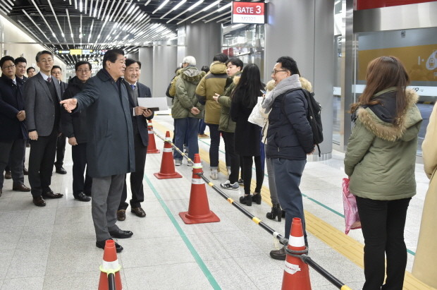 이 시장은 시공사인 롯데건설 관계자의 브리핑을 듣고 시설의 안전 등에 대해 살핀 후 버스를 승차하기 위해 기다리는 시민들에게 직접 이용에 불편함은 없는지 등을 묻기도 했다.