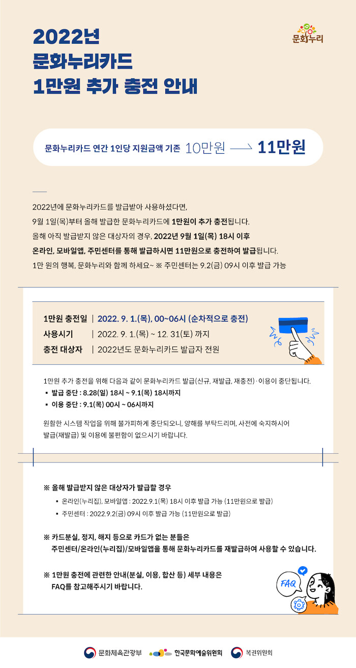 올해 문화누리카드를 발급받아 사용한 이용자는 9월 1일부터 발급한 문화누리카드에 1만원이 추가 충전된다.