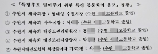 | ▲ ▲ 제보자가 제시한 수원시체육회- 태권도협회관련 간부들 명단과 특정 고등학교 졸업현황. |