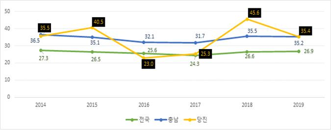 통계청이 지난달 22일 발표한 ‘2019년 사망원인통계’에 따르면 당진시 2019년 자살사망자 수는 59명으로 2018년 76명에서 17명 감소했으며, 자살률(인구 10만 명당 자살사망자 수)은 35.4명으로 2018년 45.6명에 비해 10.2명이 감소했다.